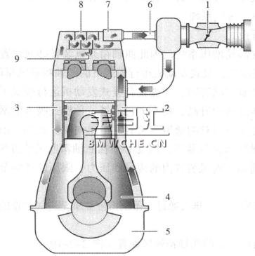 7.机油回流通道 8.废气涡轮增压器