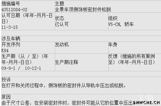 宝马PUMA技术通报-E84全景车顶侧饰板密封件松脱