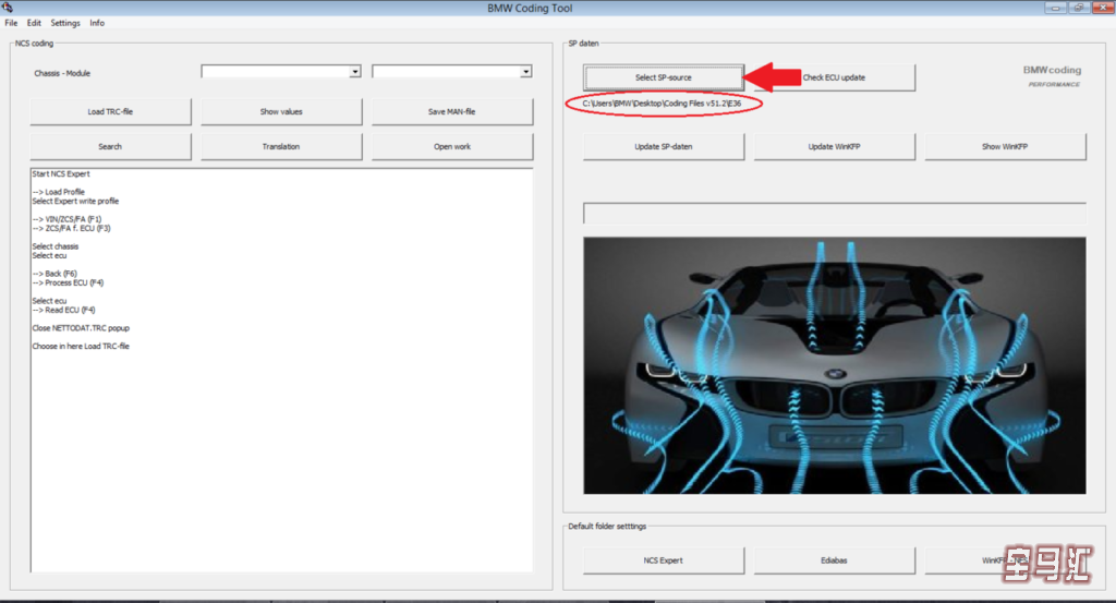 2、设置好所有文件夹后,我们现在就可以继续更新我们的spdatens了。通过选择“select sp-source”按钮,然后选择带有新spdaten的文件夹来完成此操作。我总是喜欢从最早的型号开始,那就是E36。
