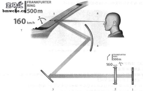 就像喷气式飞机的飞行员一样,宝马汽车的驾驶员可以利用平视显示屏在直接视野范围内看到重要的数据和图表。平视显示屏显示的内容包括:定速巡航控制(DCC)系统信息、导航系统信息、检査控制信息、车速。平视显示屏见下图。