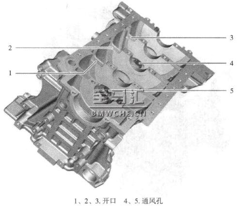 (3)补偿口。曲轴箱带有较大的銑削纵向通风孔。这些纵向通风孔可改善活塞上、下运动过程中产生的往复空气柱的压力平衡。位于进气侧汽缸之间轴承座上的附加开口可进一步完善优化效果。 N20发动机轴承座上的补偿口见图2-5-13,