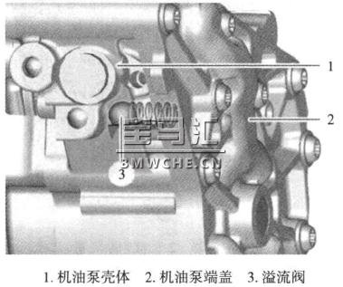 溢流阀又称为冷启动阀,它装在机油泵内,当压力在1200~ 1300kPa之间时打开并使机油直接流入油底壳内。在温度较低或机油较稠时,溢流阀可防止机油冷却模块及其密封垫损坏。N20发动机机油泵的溢流阀见下图。