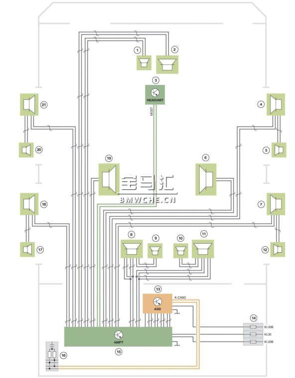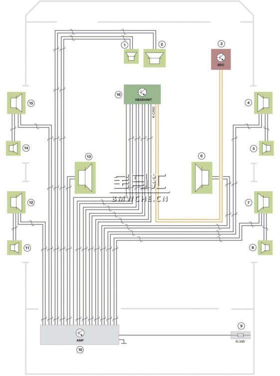 不与总线连接、带 12 个扬声器的高保真音响系统已通过众多 BMW 型号为大家所熟知。下面所示为G11/G12 高保真音响系统的电路图。
