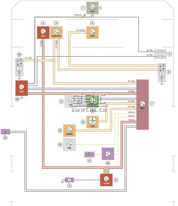 需要车辆减速时,系统首先确定传动系统可达到的减速效果以及发动机和变速箱的制动作用。将该数值发送至数字式发动机电子系统 DME 或数字式柴油机电子系统 DDE 以及变速箱电子控制系统 EGS。如果仅靠传动系统自身无法实现该数值,则将所需附加数值发送至动态稳定控制系统 DSC。