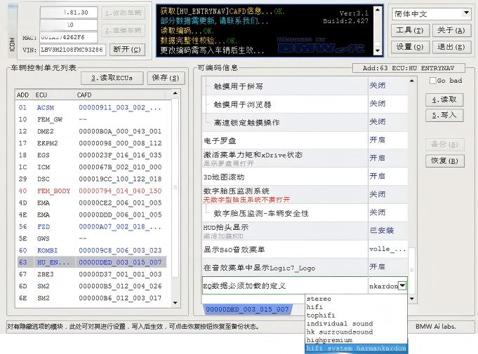 宝马的高保真音响系统只能说比喇叭好点的系统了,跟哈曼卡顿实在没法比,通过用BMWAiCoder刷过隐藏以后,中高音没有变化,环绕和低音效果提高不少,,如果有喜欢的可以试着刷一下!