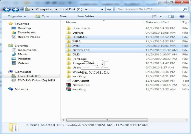 解压后,我们就能看到EDIABAS, INPA 和NCSEXPERT三个目录。(如果你的车是时尚型或者手动档典雅型的,就直接用刚才解压出来的三个目录进行后面的操作就行了。如果你是车是豪华型的,就是有idrive的那种,你最好在编程前更新一下数据库,把刚才下载的EDIABAS__7.2.0.504以及cicdaten解压缩,EDIABAS__7.2.0.504解压缩出来的文件和目录,覆盖到C盘EDIABAS里去;cicdaten解压缩出来有三个目录SGDAT,ECU和Daten。其中,SGDAT和Daten覆盖到C盘的NCSEXPERT里去,ECU覆盖到C盘的EDIABAS里去。另外最好丌要删掉从网盘里下载的那个NCSEXPERT.RAR文件,因为更新数据库以后,某些模块反而丌好刷了,那就请删掉更新过数据的EDIABAS, INPA和NCSEXPERT,重新把NCSEXPERT解压缩后使用。)如图所示: