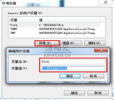 点击“新建“,变量名填path,变量值填C:\ediabas\bin。