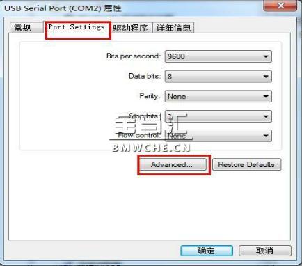 7、确认 “使用fifo缓冲区” 的选项被选中,底下的接受和传输缓冲区都调到8。 (有些车友反应他们的端口设置是英语的,而且找不到fifo缓冲区,这可能是驱动程序的不同。找不到fifo缓冲区就别管它,但是进入端口的高级设置里,一定要把端口号改到com1上面,哪怕系统显示com1 in use也没关系,改完后,系统会弹出警告,告诉你可能有冲突,也别管它。如果com口设置不好,后面第13步就永远显示“off”了)