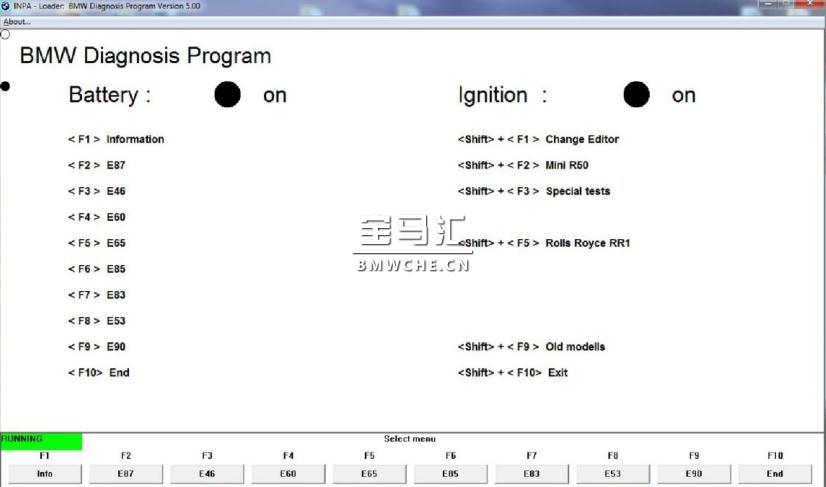 13、回到电脑的桌面,双击“INPALOAD” (我们前面刚刚创建的快捷方式),这时候应该出现这样的界面,如果battery和ignition两个圆点都是黑色的,上面都显示“on“,那恭喜你,万事俱备,只欠东风了。如果其中一个或者两个都显示”off“,那说明你的车没有和电脑正常连接,原因很多,可能是你忘记长按启动按键打开电门,也可能是端口设置问题(没有设到com1上),当然也可能是这根数据线不支持你的车(如果想继续折腾,可能要用到我第一页里说到的电焊枪改造)