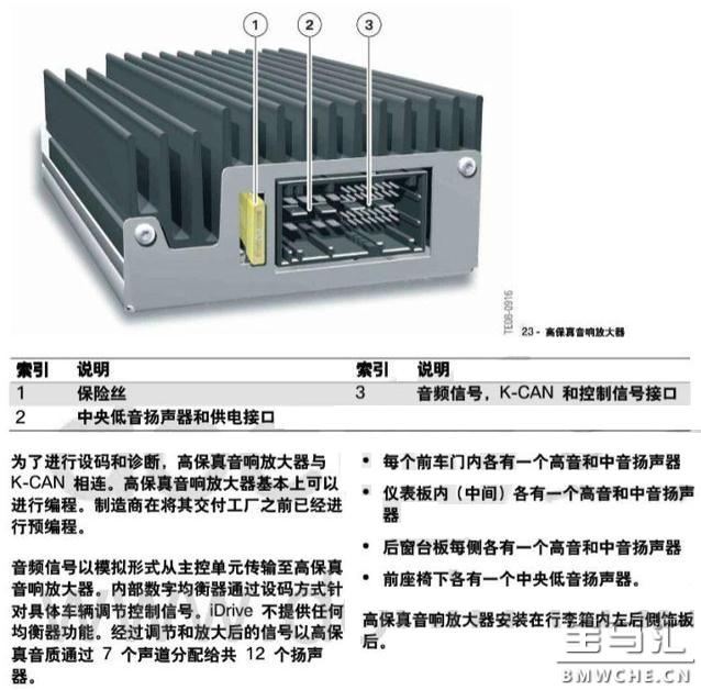 2、HIFI System 即是我们称为的高保真音响系统在BMW音响系统中属于中端级别,拥有200W的独立功放,放置在后尾箱。
